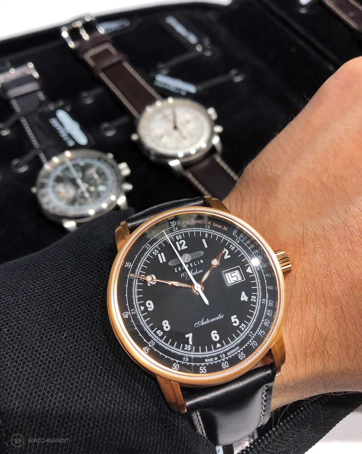 The famous Zeppelin logo was an eye catcher for us, because of its widely known pilots chronographs. We asked for a spontaneous appointment, which was luckily granted to us for the afternoon. We had a pleasant stay at the Zeppelin booth, which also housed the brands Junkers, Iron Annie and Rosenthal and we received an interesting insight to Zeppelin watches. For more than 30 years it belongs to the POINTtec electronic GmbH, which is a medium-sized company that is still independent and owner-managed. This independence provides them with the necessary decision-making autonomy and flexibility. We could feel, that the management of Zeppelin is serious about every detail in their watches during the presentation of the latest automatic watch models.