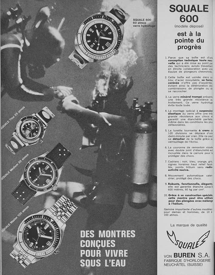 Squale SA wurde 1946 von Charles von Büren in Neuchâtel, Schweiz, gegründet und hat seinen Ursprung als bekannter Komponentenlieferant für (unter anderem) wasserdichte Gehäuse für die Uhrenindustrie. Ihr Logo eines Hais ist nicht nur besonders cool für Taucheruhren, auch wenn man sicher keinen echten Hai unter Wasser treffen möchte, sondern Squale steht auch wörtlich für das Wort „Hai“ auf Französisch (Neuchâtel ist ein französischsprachiger Kanton der Schweiz). Dieses einzigartige “Squale”-Logo eines Hais wurde in den 1970er Jahren mit Stolz von Uhrenherstellern im Sinne eines Co-Brandings auf dem Zifferblatt als Qualitätszeichen für wasserdichte Uhren präsentiert.