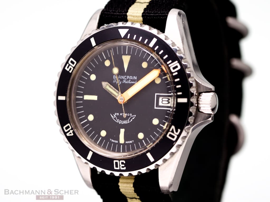 Interessanterweise verewigten die Hersteller, die damals Squale-Komponenten verwendeten, oft nicht nur den eigenen Markennamen, sondern auch den von Squale auf dem Zifferblatt, da Squale als Qualitätsmerkmal und ihr Logo als Gütesiegel galt. Hier ist ein Beispiel einer Vintage Blancpain Fifty Fathoms Squale ref. Y1545 in Edelstahl, hergestellt um 1970, die bei Juwelier Bachmann&Scher angeboten wurde. Diese trägt, wie heute die meisten Squale Modelle, das Haifisch-Logo über der 6 Uhr Position.
