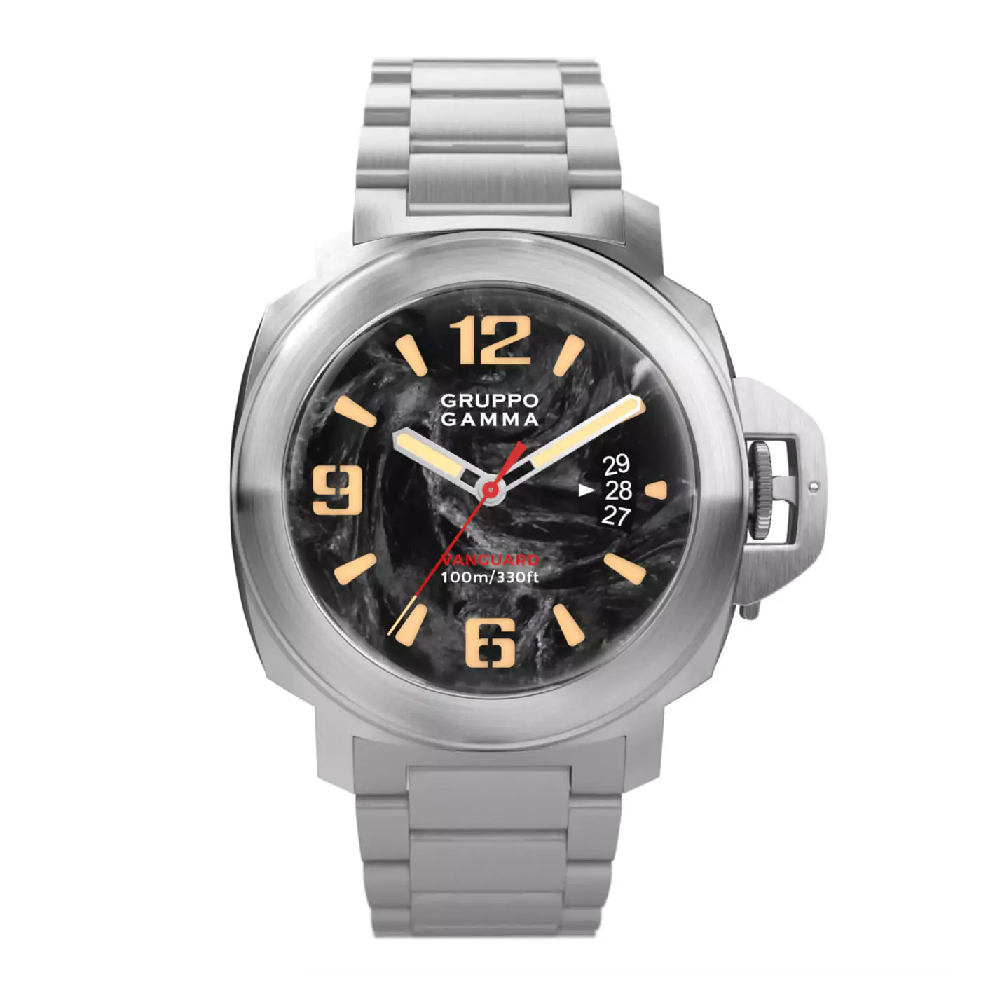 Die Gruppo Gamma Vanguard AG-11 besticht durch ihr markantes 42-mm-Gehäuse, ausgestattet mit einem Kronenschutz für zusätzliche Präsenz und Funktionalität. Das Zifferblatt aus geschmiedetem Carbon ist mit leuchtenden Adern durchzogen, die das bewegte Licht einfangen, während das Datumsfenster für eine optimale Lesbarkeit durchdacht geformt ist.