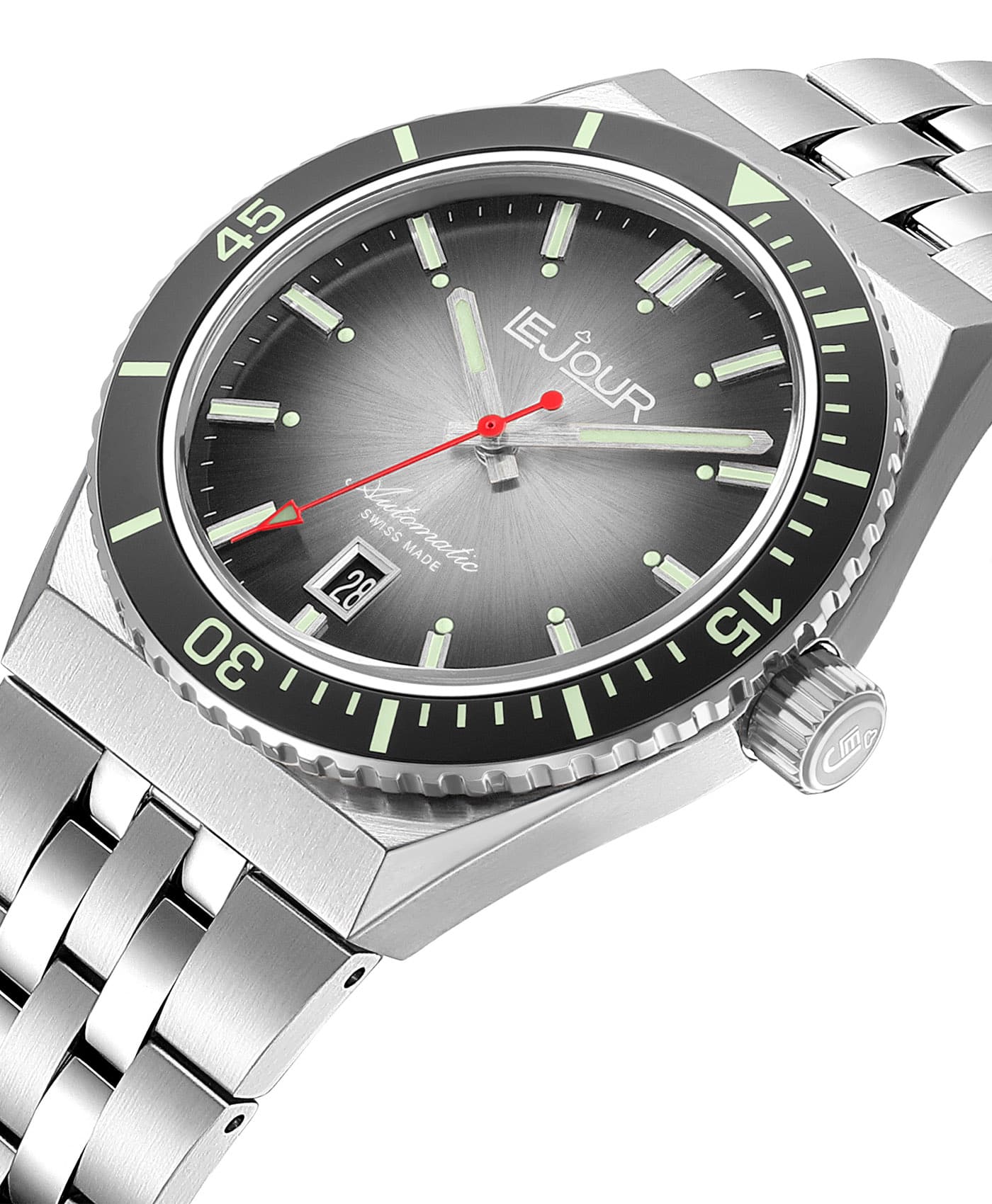 Das kreative Team von Le Jour Watches liebt es, die klassische Uhrenära einzufangen und hochstilisierte, zeitgemäße und elegant gefertigte Zeitmesser für den modernen Mann zu kreieren. Le Jour Watches ist stolz darauf, die neueste Delmare-Kollektion zu präsentieren, die die nautische Atmosphäre meisterhaft verkörpert. Das kompakte Gehäuse besteht aus 316L-Edelstahl mit einer Breite von 41 mm, einer Länge von 48 mm und einer Höhe von 13 mm, was es zu einer tragbaren und bequemen Uhr für den täglichen Gebrauch macht. Das kantige Gehäuse zeigt ein beeindruckendes Spiel aus gebürsteten und glänzend polierten Oberflächen mit raffinierten Fasen. Der Charme der 70er Jahre wird durch ein sorgfältig verarbeitetes 5-Glieder-Edelstahlarmband ergänzt, das perfekt unter das Gehäuse mit Kapuze passt. Darüber hinaus trägt die Verwendung eines kuppelförmigen Saphirglases und hochwertiger Keramikeinsätze zur Pracht der Delmare-Kollektion bei. Die Delmare verfügt über ein schillerndes Zifferblatt mit Sonnenschliff, auch bekannt als Rauchfinish. Die reiche Tiefe des Zifferblatts kommt von den milderen Farbtönen in der Mitte des Zifferblatts, die zu den Rändern hin allmählich dunkler werden, um in verschiedenen Umgebungen atemberaubende Effekte zu erzielen. Das Datum auf dem Zifferblatt ist für harmonische Eleganz bei 6 Uhr positioniert. Die Verwendung von Grade C3 – Swiss SuperLuminova auf den Zeigern und Indizes verstärkt die Lesbarkeit bei schlechten Lichtverhältnissen. Die Delmare-Kollektion von Le Jour ist in 8 verführerischen Farbkombinationen in den Ausführungen Schwarz / Blau / Grün / Grau / Braun und Roségold erhältlich. Abgesehen davon, dass sie ein stylischer Alltagsheld ist, erfüllt die Delmare die Anforderungen einer robusten Taucheruhr mit einer Wasserdichtigkeit von bis zu 20 bar / 200 m. Die Delmare wird von einem SELLITA SW200 Swiss Made Automatikwerk mit 26 Juwelen angetrieben, das für seine Genauigkeit, Zuverlässigkeit und Langlebigkeit bekannt ist. Die Delmare ist eine brillant ausgeführte Uhr mit faszinierendem Rauchzifferblatt, praktischer Größe, Schweizer Automatikwerk mit einem Retro-Welt-Charme.