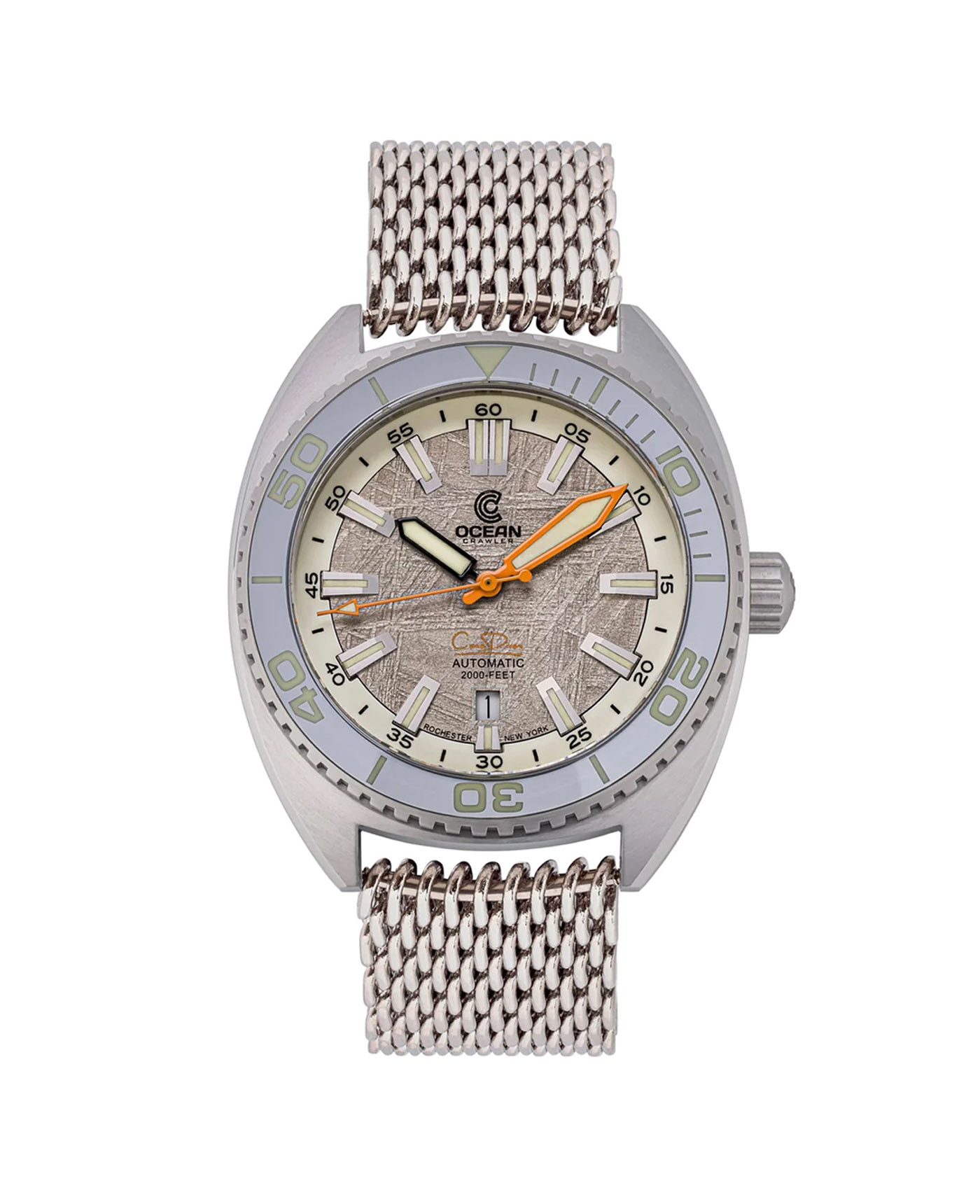 Jeder einzelne Ocean Crawler wurde in Wasser getaucht und gründlich getestet, um einem Druck von bis zu 2000 Fuß standzuhalten. Dies macht es zu einem unverzichtbaren Unterwasserzubehör für Wassersportler, die tauchen, Speerfischen betreiben und sogar den Meeresboden erkunden. Diese limitierte Sonderedition verfügt über ein Dekompressions-Timer-Zifferblatt, das die erforderlichen Dekompressionsstopps während eines Tauchgangs anzeigt. Die Uhr verfügt außerdem über eine einseitig drehbare Lünette, die vollständig aus Saphir besteht und Stundenmarkierungen trägt, die mit sieben Schichten Schweizer C3 Lume gefüllt sind. Leistungsstarkes C3-Lume auf den wichtigsten Elementen garantiert perfekte Lesbarkeit beim Tieftauchen. Das Uhrwerk im Inneren ist ein reguliertes Sellita SW200-1 Uhrwerk. Es hat eine Schlagfrequenz von 28.800 Schwingungen pro Stunde und wurde für zusätzliche Genauigkeit verbessert. Vom Ocean Crawler Dekompressionstimer werden nur 100 Stück pro Farbe hergestellt und alle von insgesamt 100 Exemplaren sind mit einer eindeutigen Seriennummer versehen.