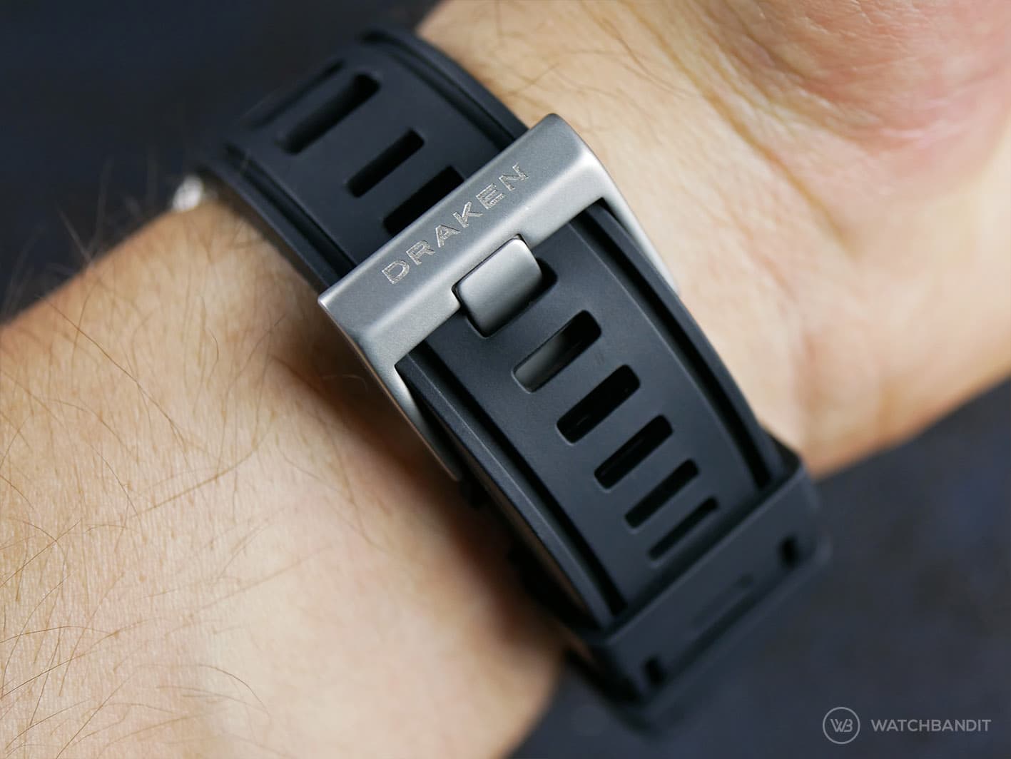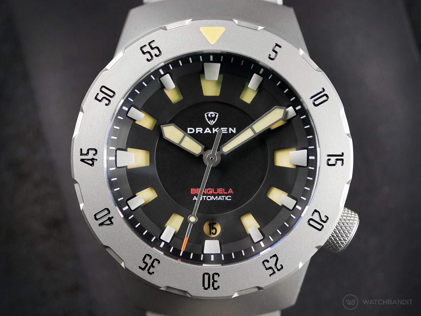 The Draken Bengula is a “tool watch” through and through: Technical modern design, easy to read at day and night, matte bead-blasted stainless steel, Helium Escape Valve and an overall extremely solid time piece for any adventure. It comes in three dial color options: Navy Blue, Satin Black, and Olive Green and two movement options: Japanese Seiko NH35A and Swiss ETA 2824-2. In this review we will take a closer look on the Benguela Black NH35A. Most important facts of my first impression upfront: Wrist shots are taken on a 18 cm / 7 inch wrist and it appears and wears more like a 41 mm watch than its actual 43 mm in diameter balanced by its lugs, but more on that later. With a weight of 221 grams it is certainly not a light watch, but it underlines its solid tool-watch character very well and when mounted on the natural rubber strap, it wears very balanced. Now we will have a closer look and explore the depths and details together.