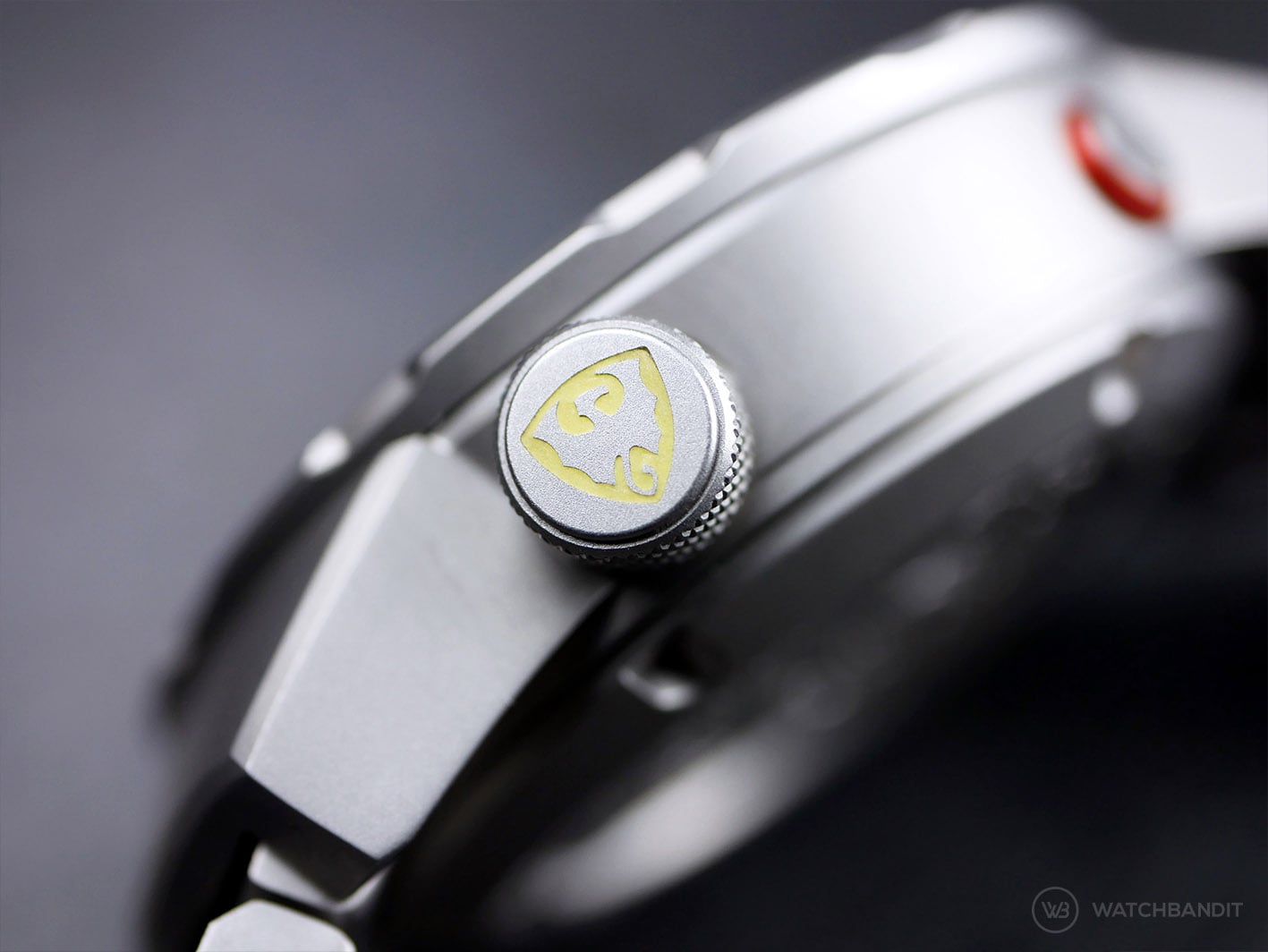 The helium escape valve is nicely worked into the case and its bright orange color underlines the importance of such valve