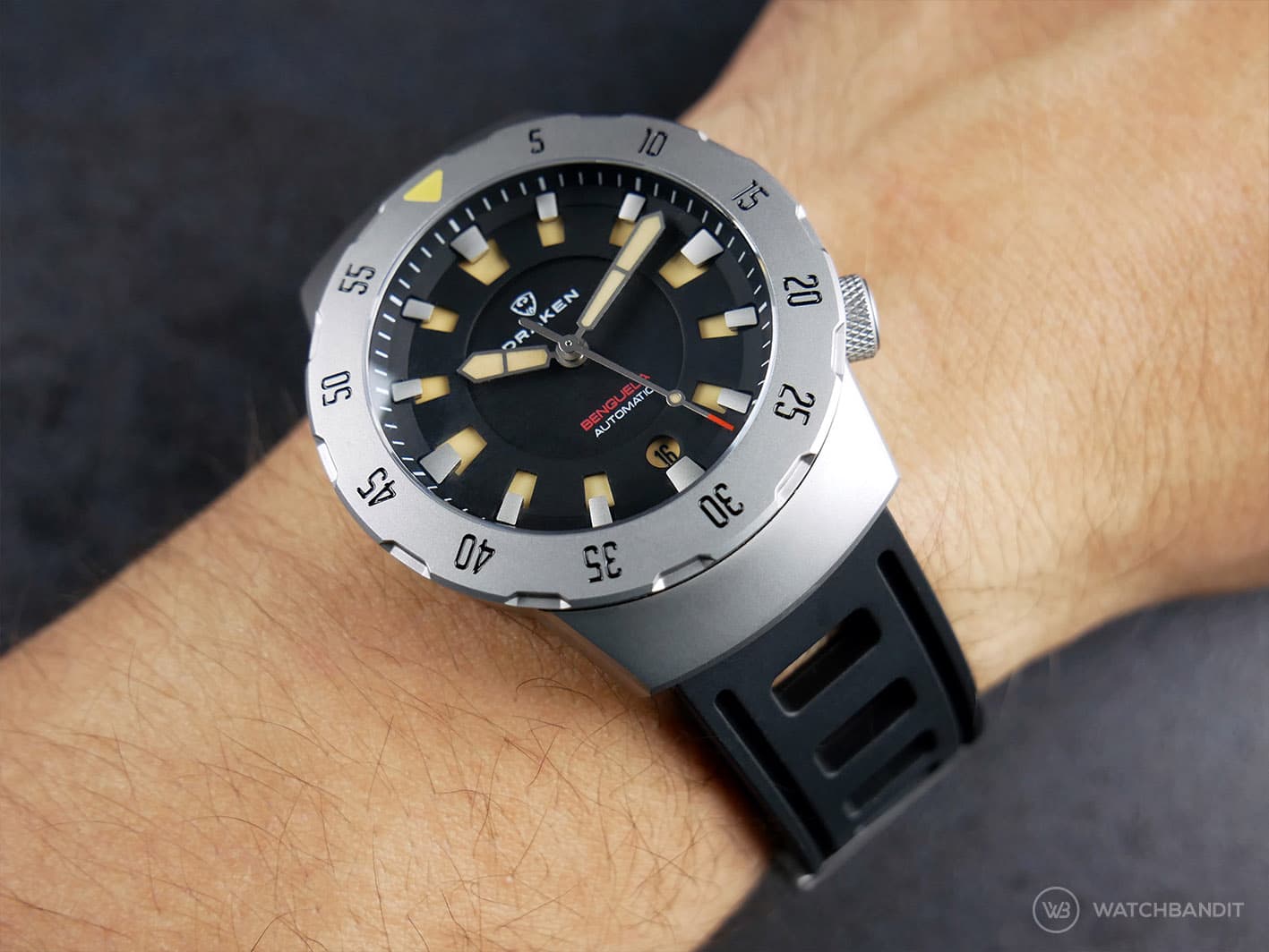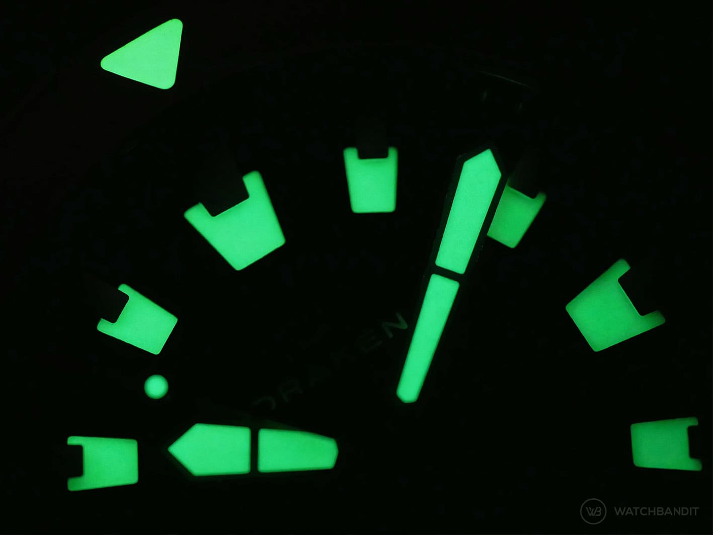 Keeping symmetry and yet increasing readability even more, the date wheel is luminous again with black numerals printed on it. Only a few watches feature this detail and in the lume shot below you can see how great the watch can be read in the dark, even the date. Taking a night dive is no problem for the Bengula as well; As a true dive watch the 60 minute mark on the bezel is lumed as well. The function is actually quite simple: before a diver’s descent, the 60 minute bezel marker is aligned with the minute hand, allowing the elapsed time, up to 60 minutes, to be read on the bezel. Which is why quite dive watches come with a particularly prominent minute hand, which in the Bengula look like swords to tame the dragon.