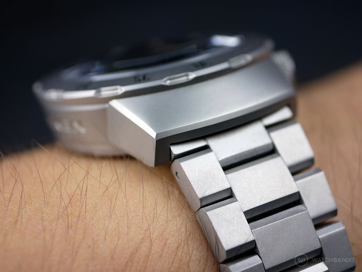 Although the curved hooded lugs on the Benguela do make the lug to lug distance appear longer, the actual springbar to springbar distance is relatively short (43.6mm), which makes the rather heavy watch very comfortable wear. It also balances the relatively large case size of 43 mm and makes it feel like a 42 mm watch. It is using the same 22mm bead-blasted bracelet with its untapered style of the Tugela 2.0, but with flat end links to fit the hooded lugs. The bracelet feels solid on the wrist and with its matte bead-blasted finish, it’s also not as flashy as other dive watches with polished bracelets and underlines the tool-watch character. As you can see in the close up, every edge is finished with precision.