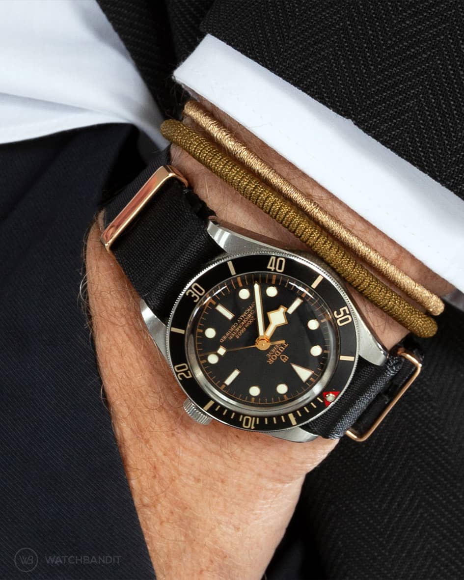 Tudor Black Bay 58 Pocket Shot on black rose gold NATO strap by Watchbandit