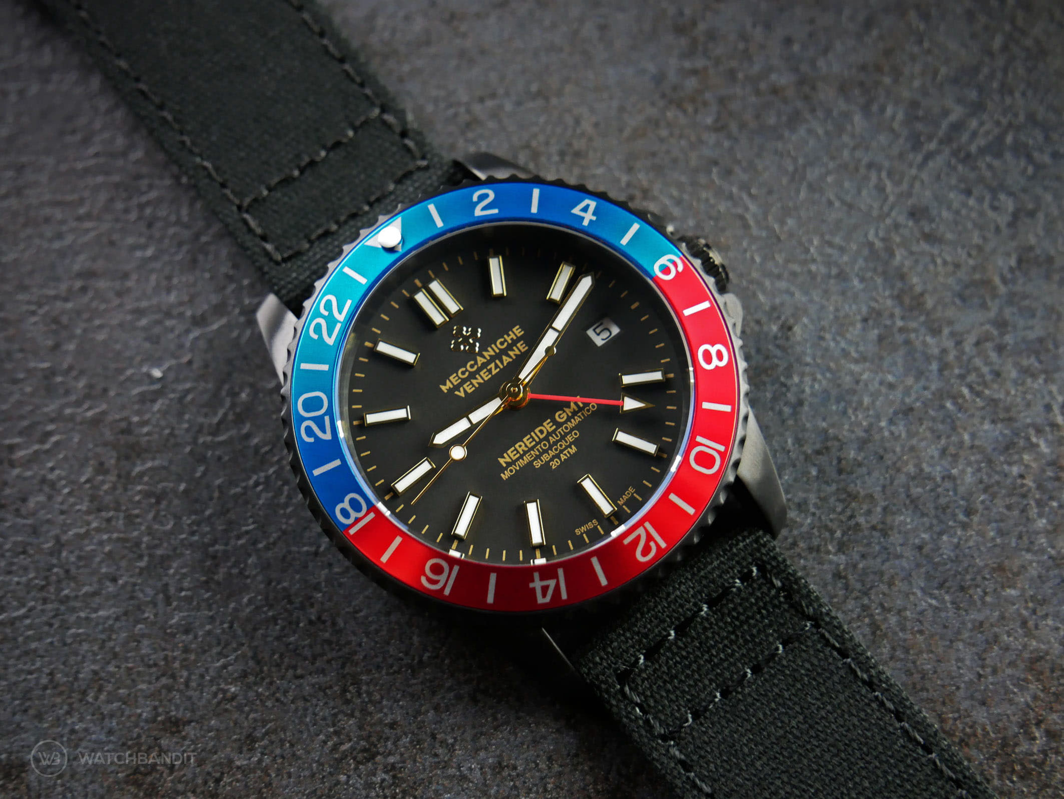Meccaniche Veneziane Nereide GMT Diaspro PVD paired with a black WB Original Canvas strap