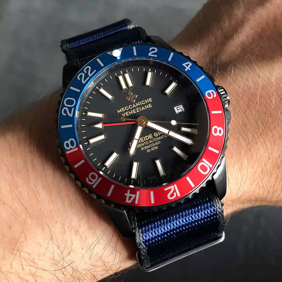 Meccaniche Veneziane Nereide GMT Pepsi PVD Watchbandit wristshot