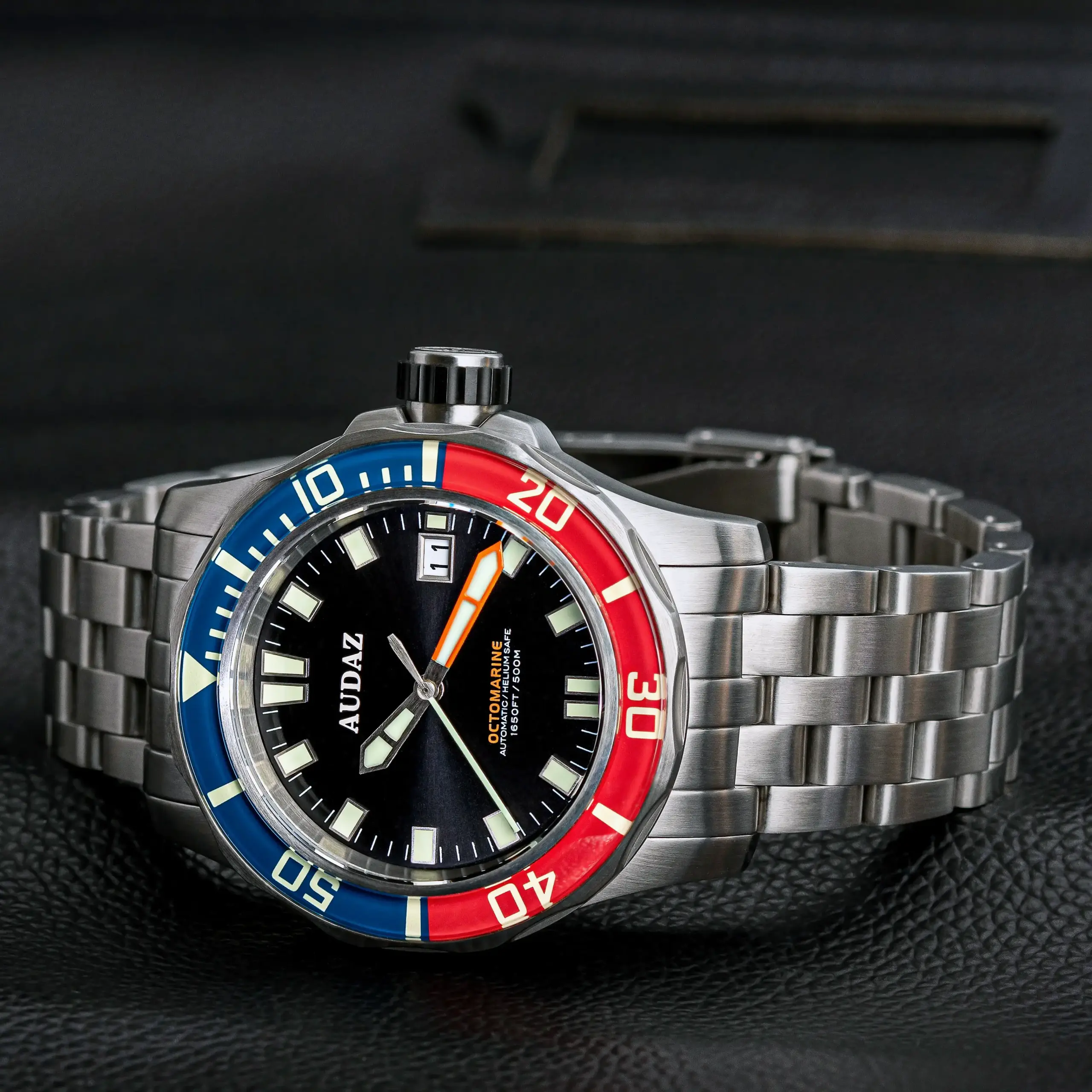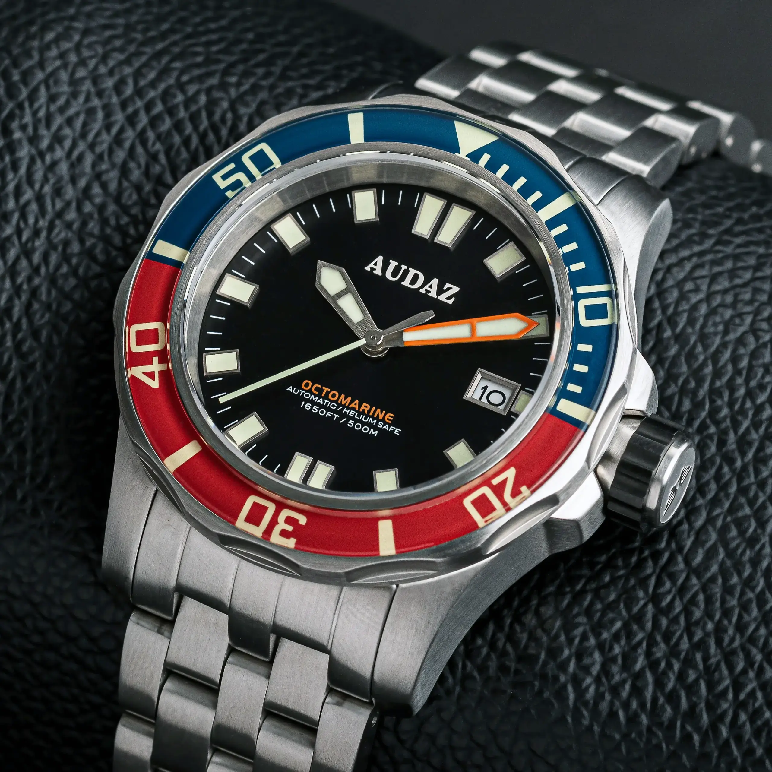 Bold by design, Audaz Watches deliver professional-grade dive performance with striking style. Crafted from 316L stainless steel and protected by sapphire crystal, each model combines rugged durability with refined detailing. With Swiss Super-LumiNova, reliable automatic movements, and water resistance up to 1000m, Audaz watches are built for those who live boldly – whether on land, at sea, or beneath the waves.