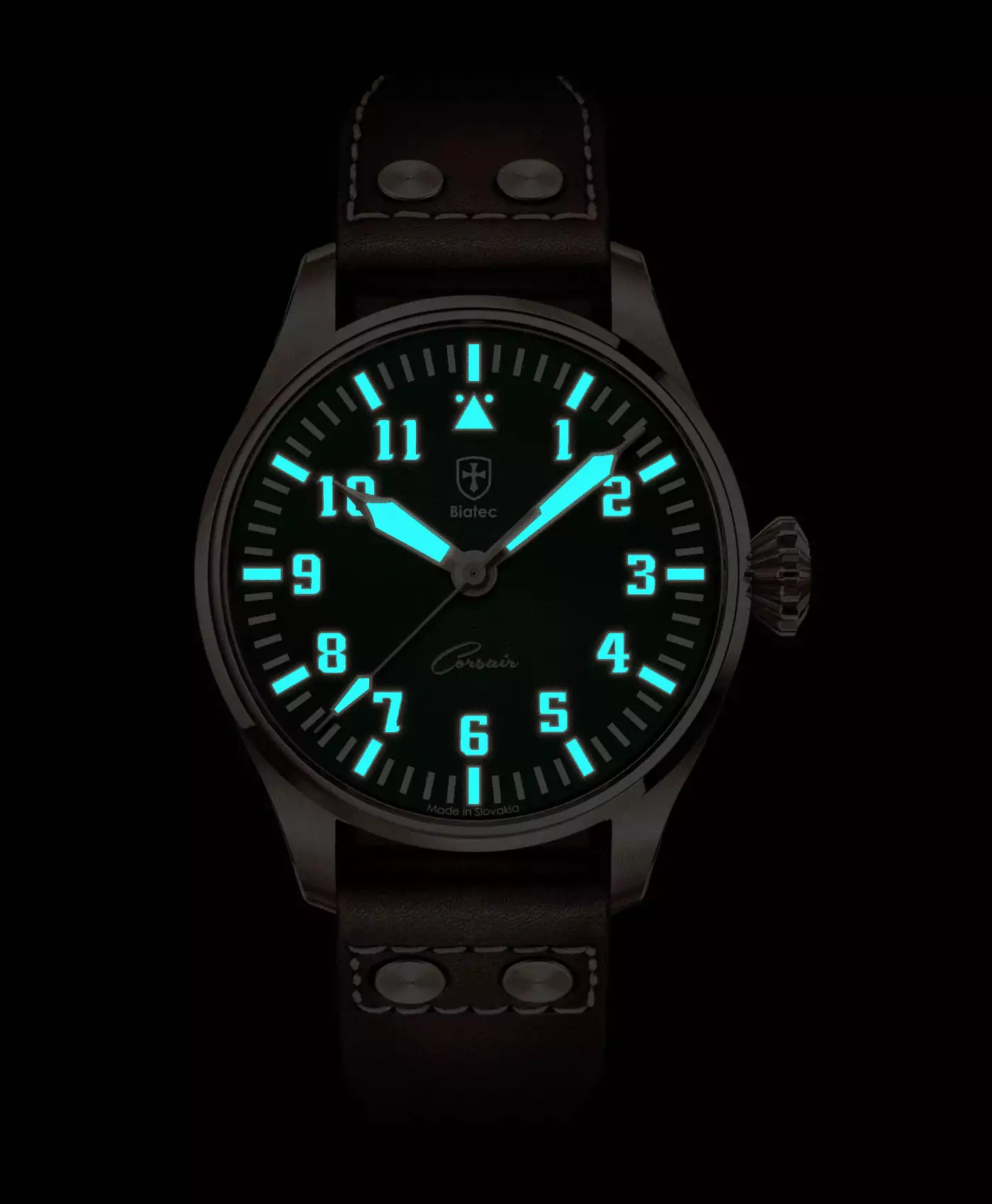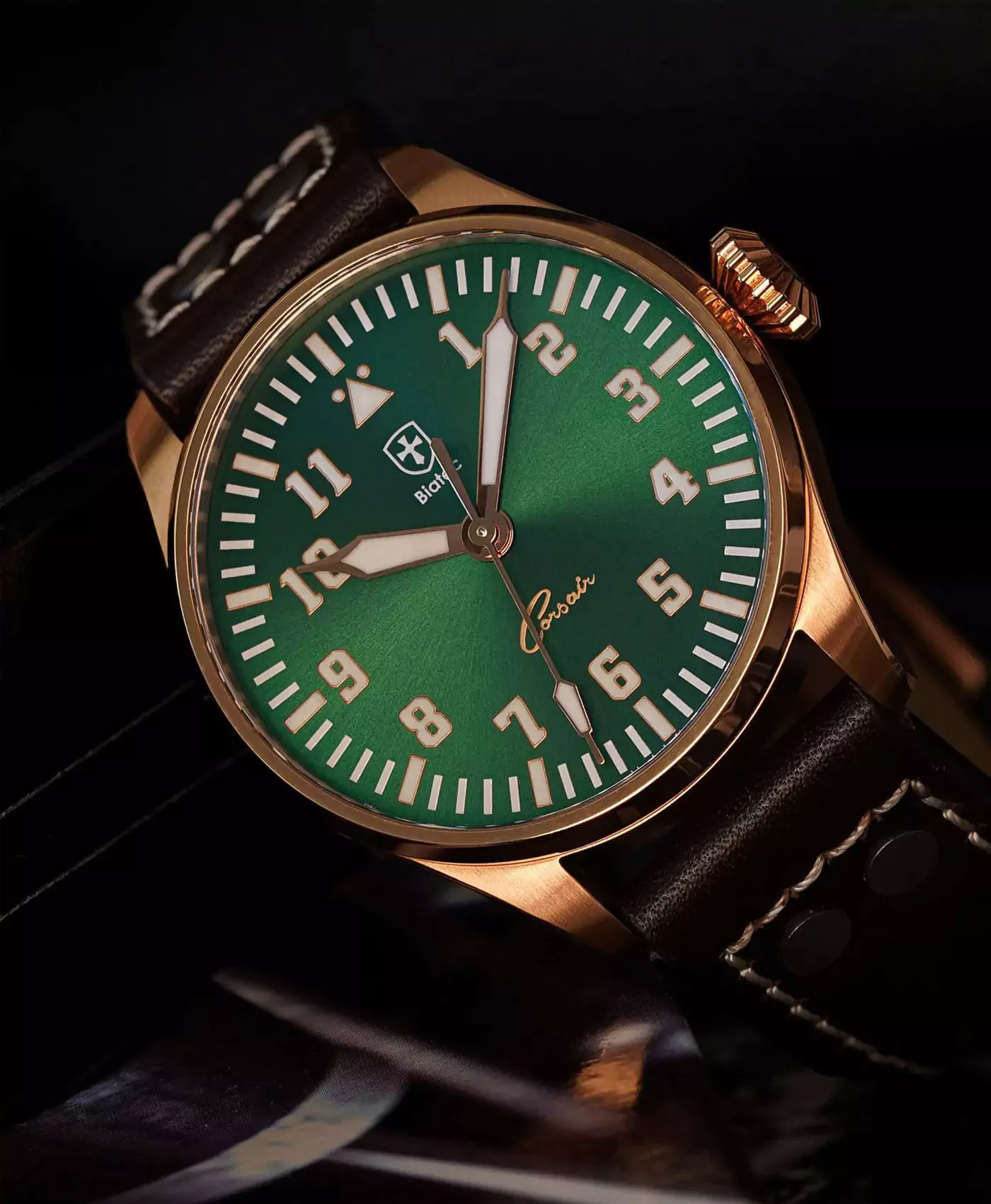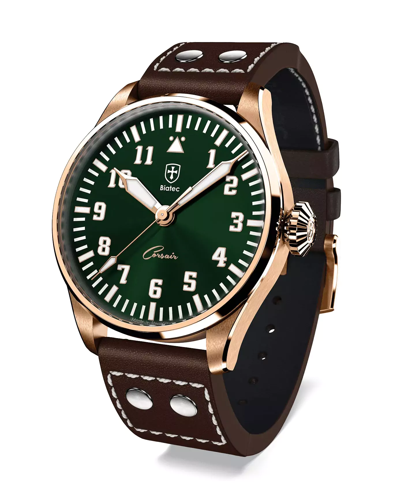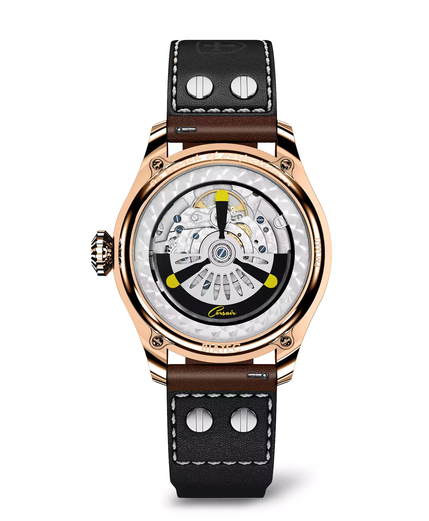 Inspired by the legendary F4U Corsair fighter plane, the Corsair Collection captures the essence of aviation history and timeless design. Created for pilots and enthusiasts alike, these watches are both functional and versatile, reflecting the precision and reliability demanded by aviators during their missions. The custom propeller rotor visible through the transparent caseback is a tribute to the Corsair’s iconic propeller.
