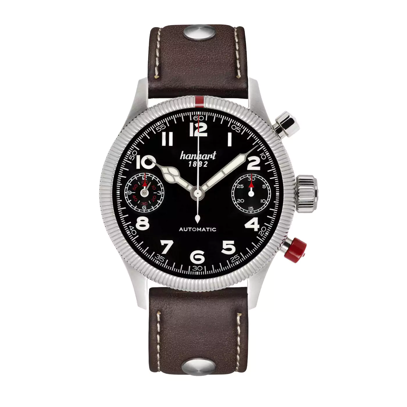 Housed in a bold 45 mm stainless steel case, the watch blends satin-brushed and polished surfaces, exuding a refined yet robust presence. The iconic fluted bezel with red marker, the oversized crown for easy grip, and Hanhartโs trademark red reset pusherโsteeped in legend and function, reinforce the watchโs pilot heritage. A screwed case back ensures 10 bar water resistance, while a riveted calfskin strap or optional stainless steel bracelet provides enduring comfort and style. True to the PIONEER legacy, the TwinDicator pays tribute to Hanhartโs roots in aviation with contemporary mechanics and a visually striking dial, making it an essential for collectors and chronograph enthusiasts alike.