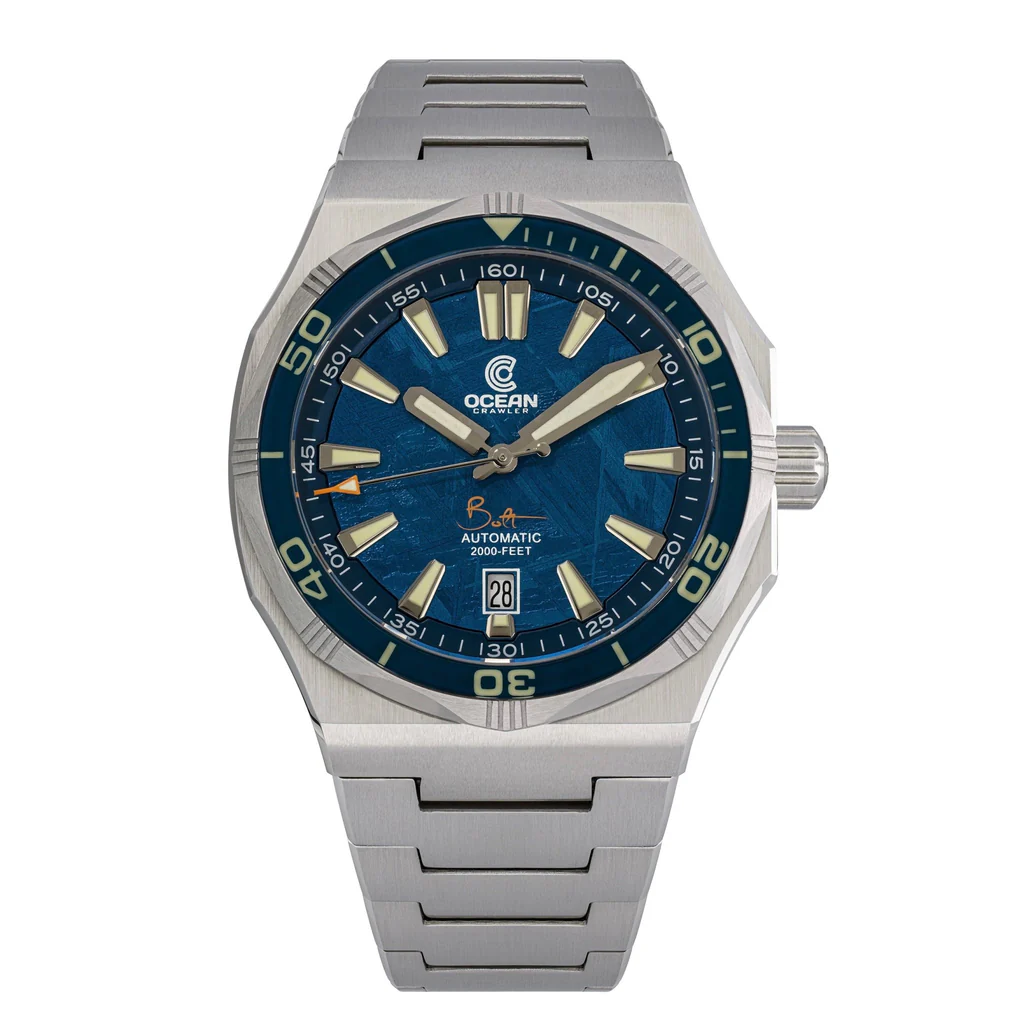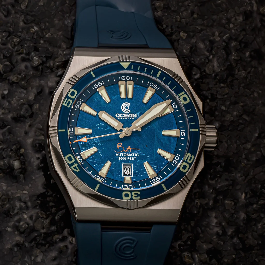Cosmic Impact: A Dive Watch Forged in the Stars. The Ocean Crawler Bolt returns with three cosmic meteorite dials, Space Gold, Blue- and Black Meteorite, each limited to 33 pieces. Cut from a 4.5-billion-year-old meteorite, these ultra-thin 42mm dive watches feature 600m water resistance, an all-sapphire bezel with Swiss C3 lume, and a regulated Sellita SW200-1 movement. Comes with integrated bracelet and rubber strap. Built for adventure. Born in space.