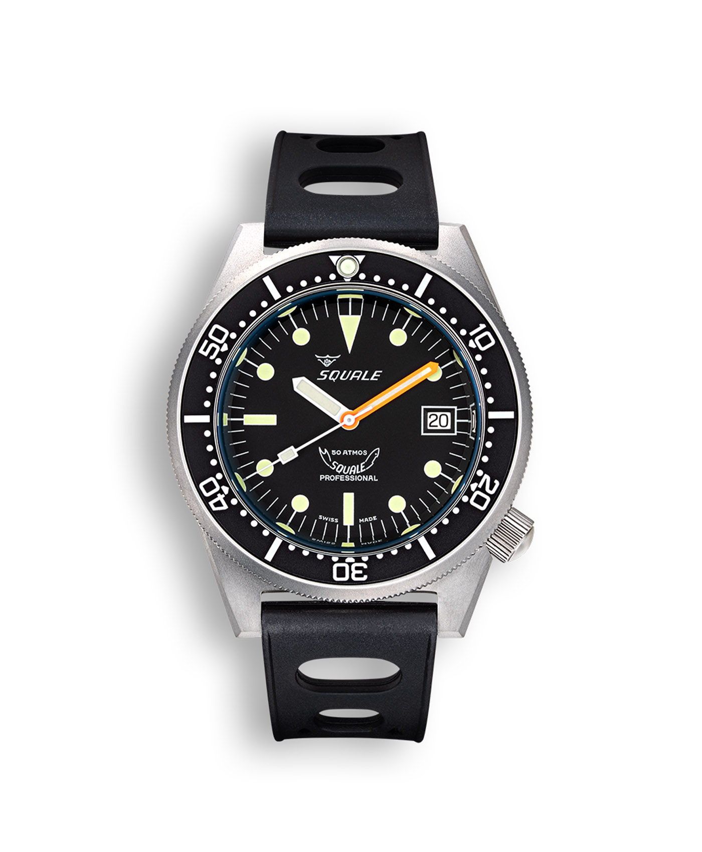 The great Swiss tradition of precision watchmaking, combined with solidity and durability: as tradition demands, the case is made throughout from Swiss 316L steel. The components are all Swiss, too: winders, winder sleeves, and gaskets. These are essential parts of a watch that has to withstand high pressures and salt water. Watches are painstakingly assembled by master watchmakers, taking the greatest care over the fitting of the gaskets and ensuring that the case is airtight; this then undergoes strict checks, with regard to both resistance to water and timekeeping accuracy. Quality tests are performed on every single watch and not on a sampling basis. Last but not least, the movement’s reliability is certified by the fact that Squale has always been a direct customer of the ETA Factory at Grenchen, guaranteeing that all movements are of prime quality.