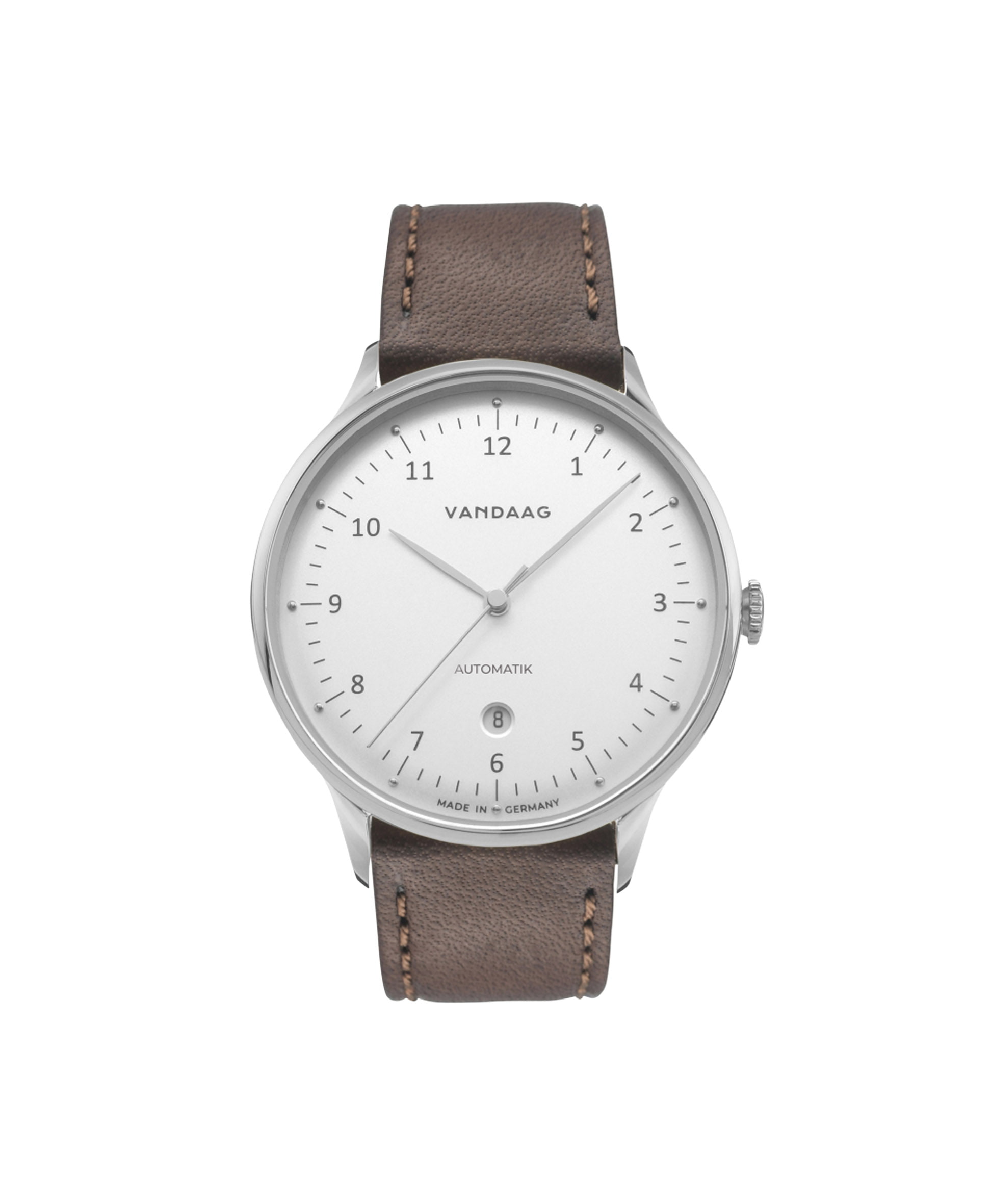 VANDAAG is Low German and means “today”. And today is the beginning of the time for watches with a typical North German character: straightforward design, timeless lines, uncompromising quality – and that Made in Germany. With its 40mm case pf the Primus, soft leather strap, finely curved black dial and clear Arabic numerals, the Primus is a timeless beauty.
