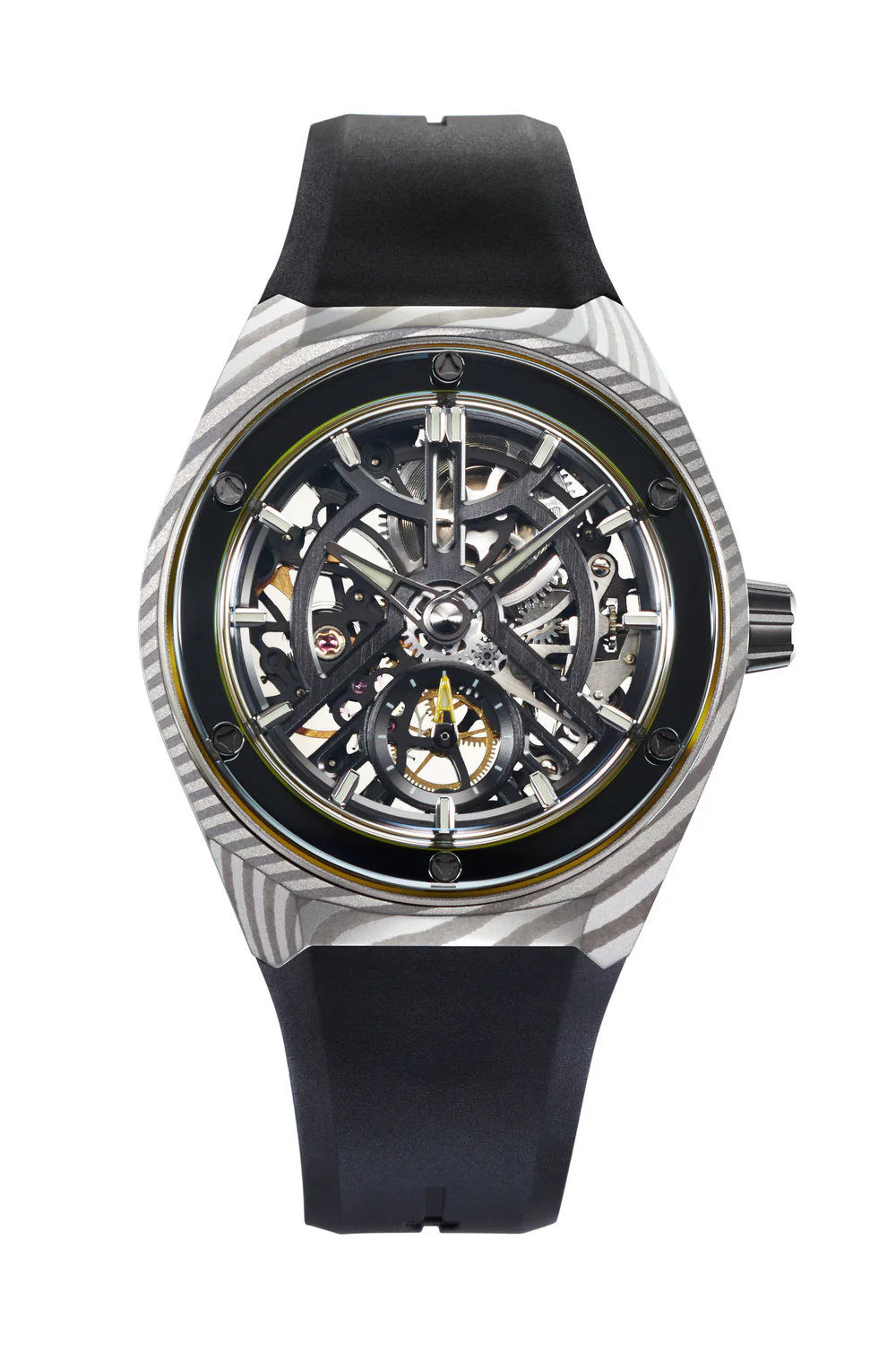 Damascus steel is produced by an ancient technique of forging knives to produce a beautiful woodgrain pattern and increased hardness. This is achieved through multiple layers of steel that has been forged and twisted under high temperatures to achieve these unique patterns, with no two pieces being alike. The Damascus Artemis features subtle yellow O-rings with a yellow sub-second hand to match, with a titanium midcase