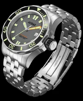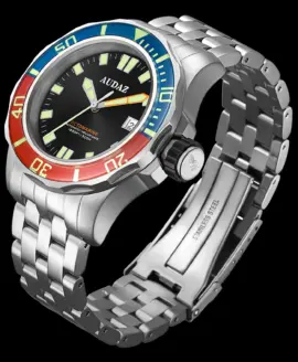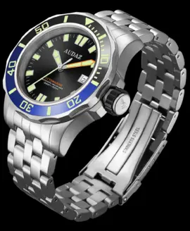 The Audaz Octomarine 500M embodies the essence of professional dive watch engineering — bold, functional, and made to perform under pressure. Crafted from solid 316L stainless steel with a compact yet powerful 42 mm case, it delivers exceptional durability and 500 m water resistance, making it ready for any underwater expedition. The 5-link stainless-steel bracelet ensures a secure and comfortable fit, matching the watch’s rugged confidence.