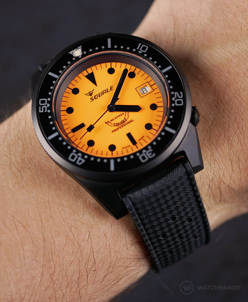 Squale Luminoso Arancia PVD paired with an Orange Classic-Style FKM rubber strap by WB Original