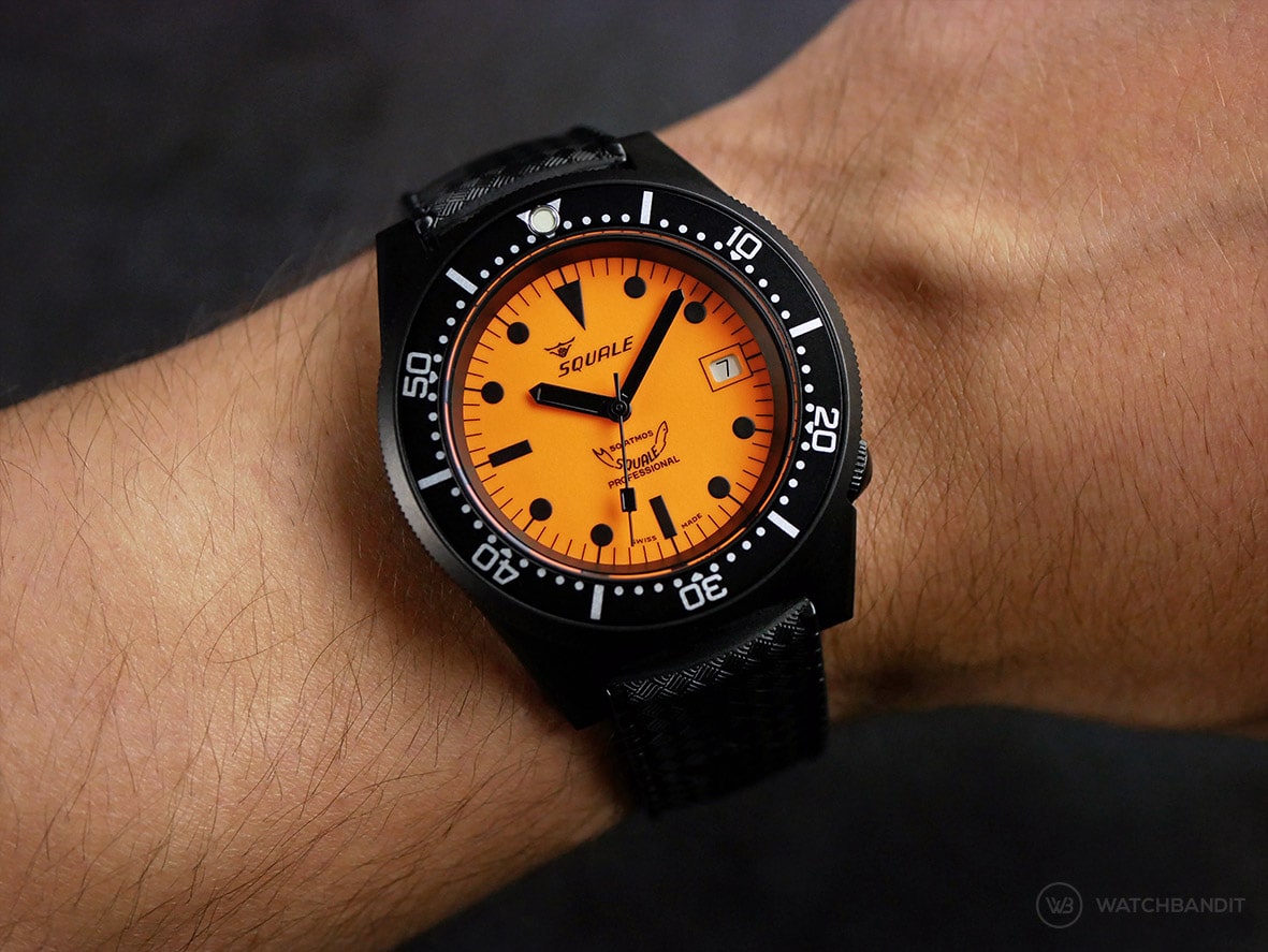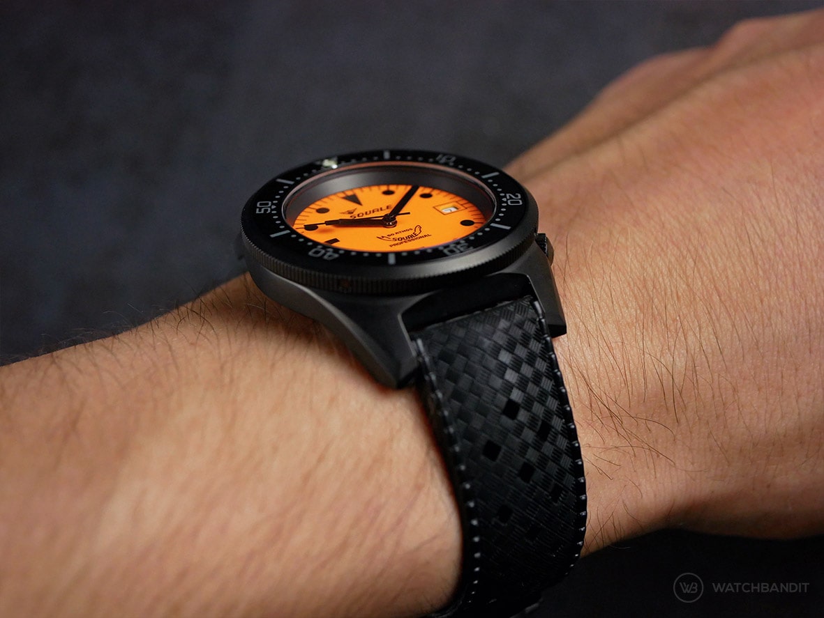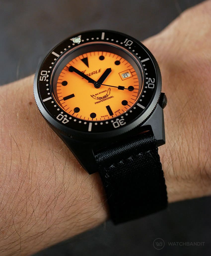 Squale Luminoso Arancia PVD with 42 mm in diameter on a 18cm/7″ wrist (wears like a 40 mm)