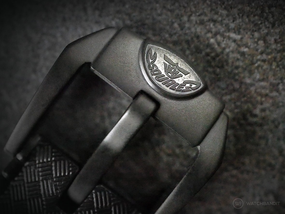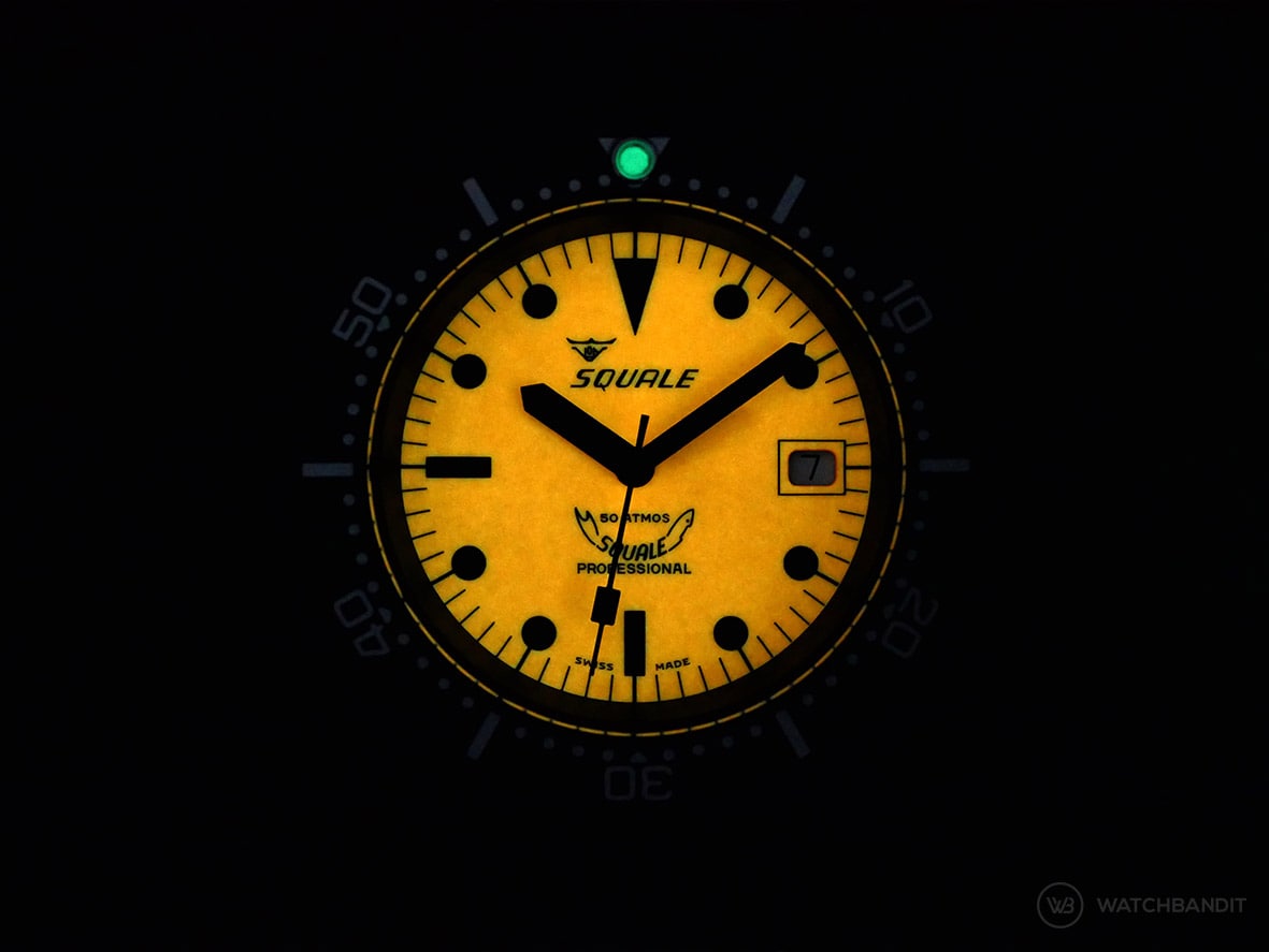With a thickness of 13 mm the watch has the classic dive-watch presence on the wrist; It is not a flat watch, but also not too thick that it might become uncomfortable. Proportions are quite standard and shouldn’t bother anyone, even with smaller wrists. The following should not come across as self-praise, but the Squale tropic rubber strap is not of the comfort and quality like ours; It is not uncomfortable though, but for my personal taste it is a little too shiny and not soft enough. Fortunately the watch has a very common lug width of 20 mm and matches our straps very well, of which we will present you a few examples later in this article.