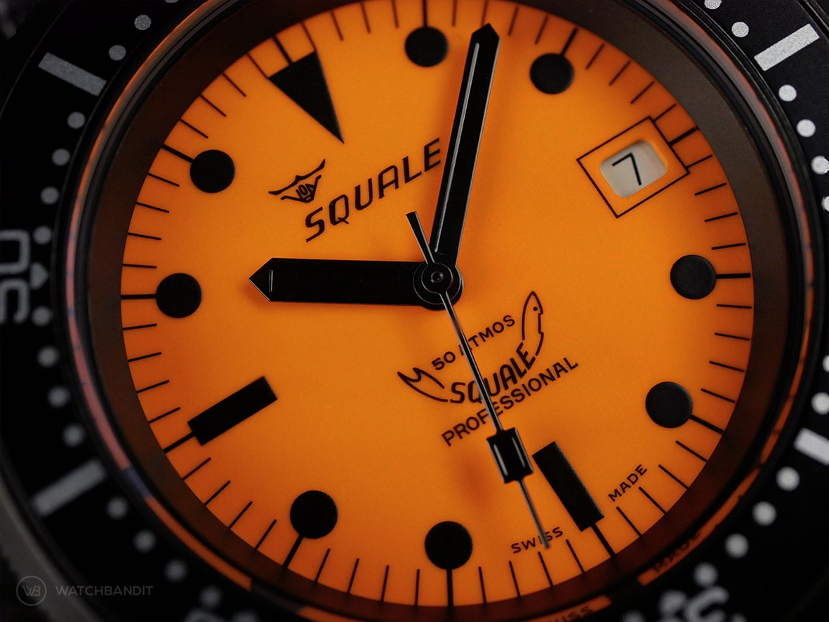 Close up of the neon-orange luminous dial (no lume shot)