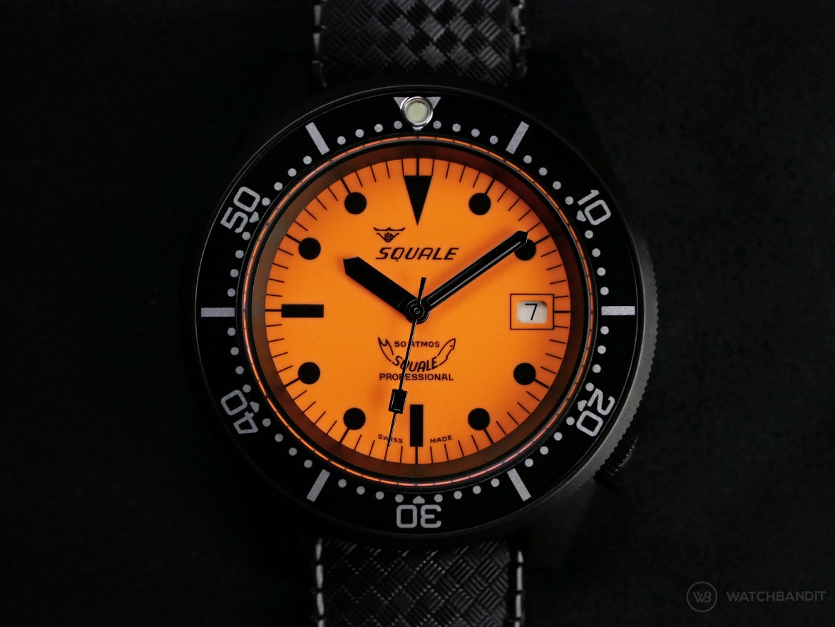 When you hold the Squale Luminoso Arancia PVD in your hands and when you are familiar with firearms, you might get that certain feeling of gunmetal. That is because the PVD finished steel is coated and finished by the famous Italian weapon manufacturer Beretta. This makes this watch extremely durable, which we pointed out in a very early blog post about Squale diving watches already. For a veteran and hobby shooter like me, this feeling is unmistakable and very special.