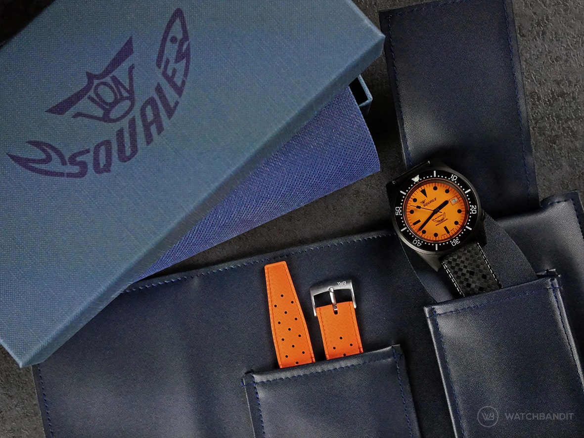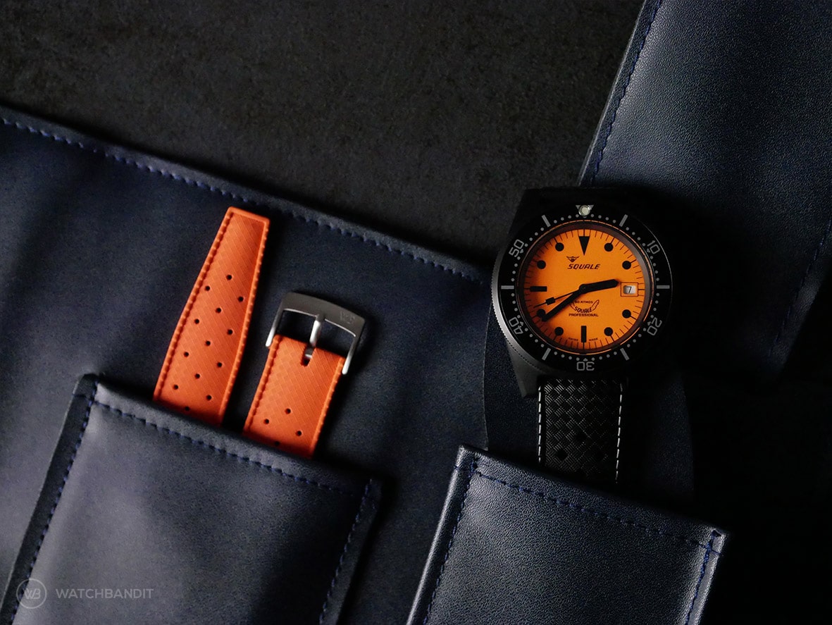 Who would have thought that this watch can be versatile in straps? Our Black PVD Two-Piece strap is the perfect alternative if you are not a fan of rubber straps and it has a matching PVD buckle. If you are looking for a softer, more matte tropical style rubber alternative, you can check out our orange- and black Tropical-Style FKM rubber strap and swap the buckle with the original PVD Squale buckle. If you want a plain and more versatile rubber strap you can pair the with our orange- and black Classic-Style FKM rubber strap.