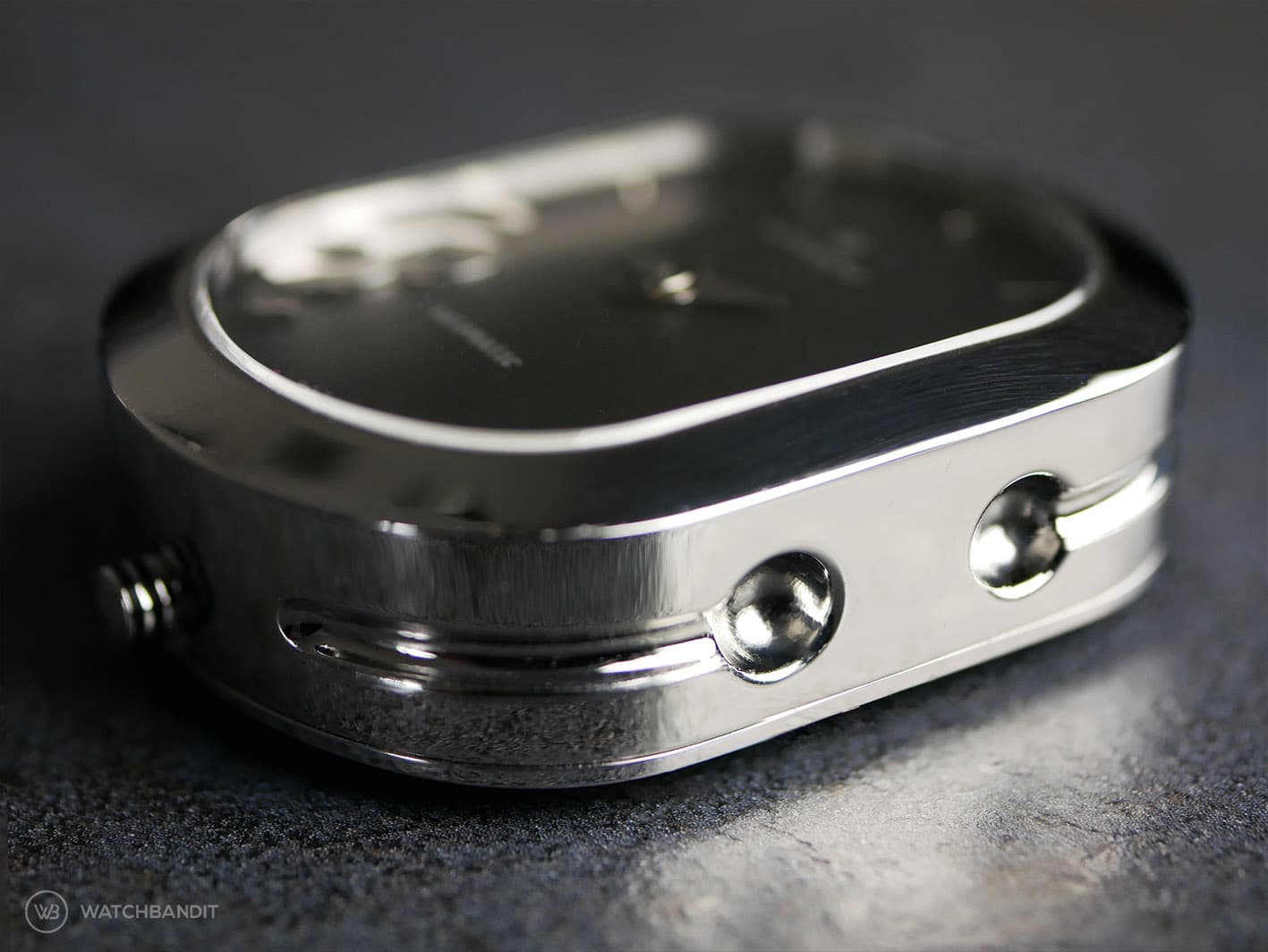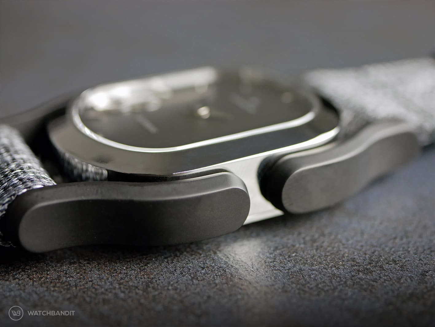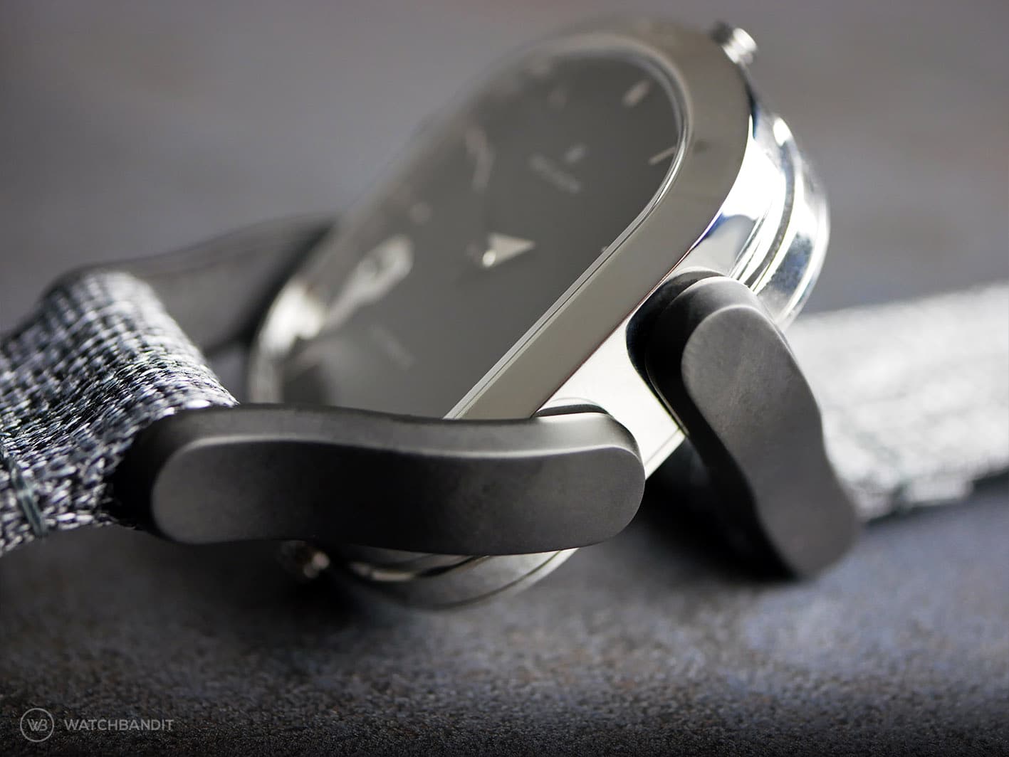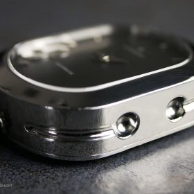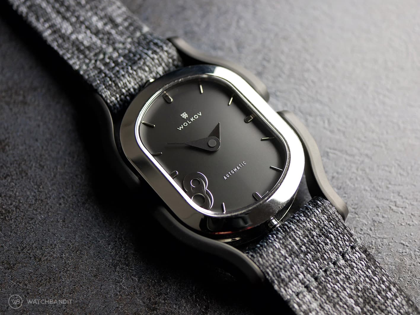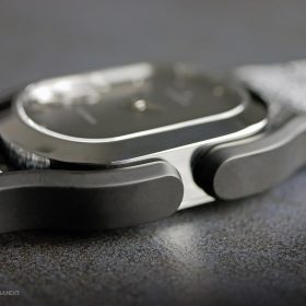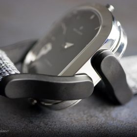 This watch is the original Wolkov release: Chrome finish case with two different straps included: Charcoal polyamide (kind of nylon fabric style) and a genuine leather strap. The Design is definetely nothing you’ll see often; Huge lugs that aren’t part of the case, but the watch strap and it’s brilliant and yet simple mechanism. It holds on to the watch case like a clip and is therefore easy and without tools to change. The oval shaped case houses two watch movements, one is mechanical and one is quartz, and is holt together by 6 screws, that influence the watch design in a very sporty way. I never had a watch like this on my wrist before; It’s definitely not everyone’s cup of tea, but it couldn’t be more unique, so that it becomes a fascinating.